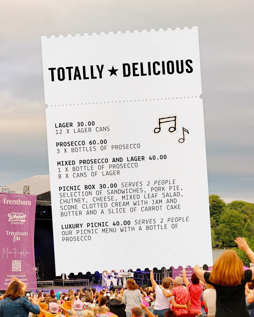 The picnic collection point will be clearly signed and next to the catering trailers at Trentham Summer Concerts. When collecting your picnic or drinks package, please head to the collection point and display your confirmation email, our team will then be on hand to help.